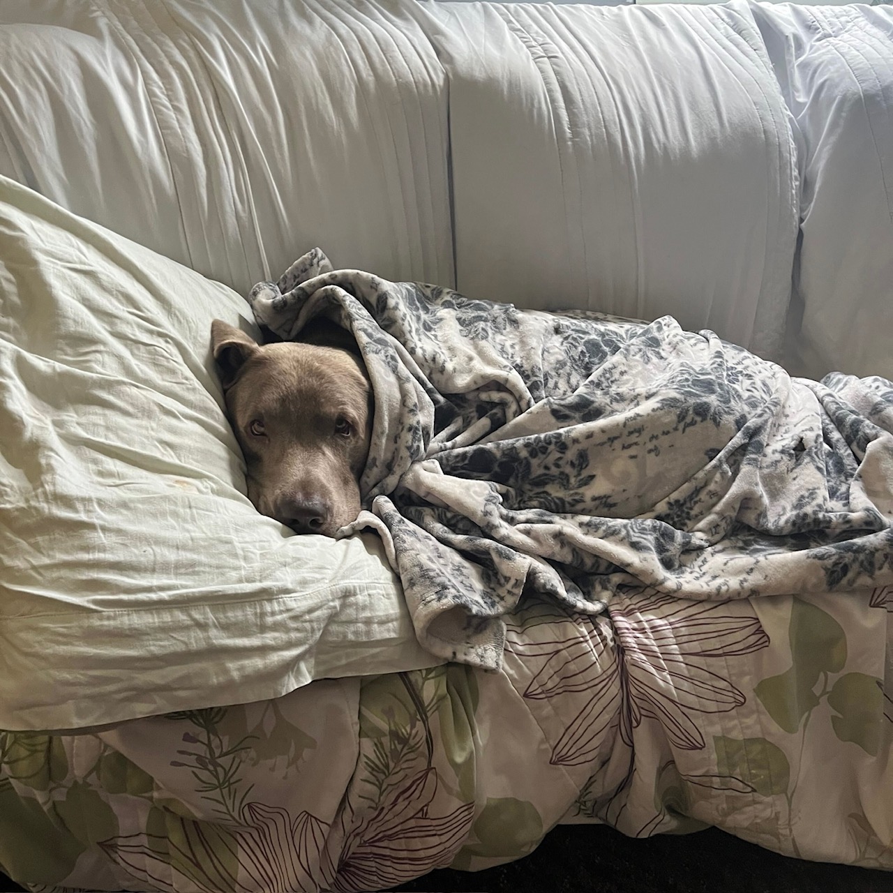 | Our November winner is none other than Cooper, the big, handsome lab with the soul of a wise old gentleman and the heart of a total sweetheart – and the undisputed King of the Break Room. Cooper is perfectly capable of group play — and when he joins in, he mostly just vibes — but let’s be honest: his true calling is the break room couch. Somewhere along the way, what started as a break room cleanup turned into a full-on Cooper room makeover, complete with blankets, pillows, and a cozy setup fit for day care royalty. Cooper confidently decides his fate each day: group time if he’s feeling social, or couch time if he’s feeling… regal. Yes, it’s true – Cooper is a nap champion. And while people love to stop by to tuck him in when he is found snoozing, don’t be fooled – he will still rise for butt scratches, and every now and then, he surprises us with zoomies or goes from sleepy sleep king to absolutely wild for a tennis ball. Cooper gives us a reason to smile every day. He’s great on walks and it’s worth mentioning that he has even mastered the stairs, for a well-earned treat tax! A huge congratulations to Cooper’s humans. Thank you for choosing Love My Doggy Day Care and sharing this wonderful boy with us. We hope you enjoy your silly prizes and all the bragging rights! All Hail the Couch King. |
